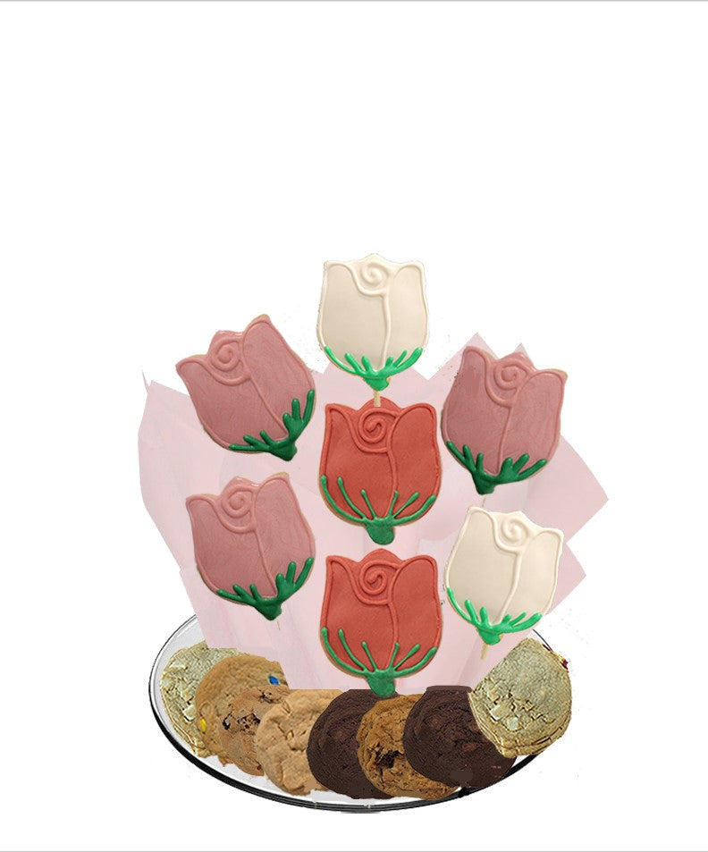 Surrounded by our deliciously freshly baked gourmet cookies and your choice of 5, 7 or 12 rose sugar cookies make the best birthday gift ever!