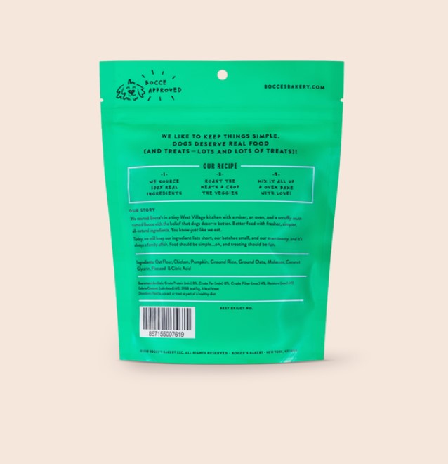 * Baked in the USA Ingredients: Oat Flour, Chicken, Pumpkin, Ground Rice, Ground Oats, Molasses, Coconut Glycerin, Flaxseed, Citric Acid